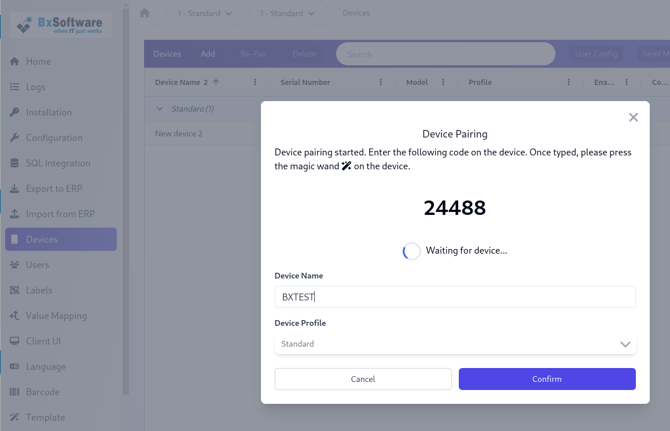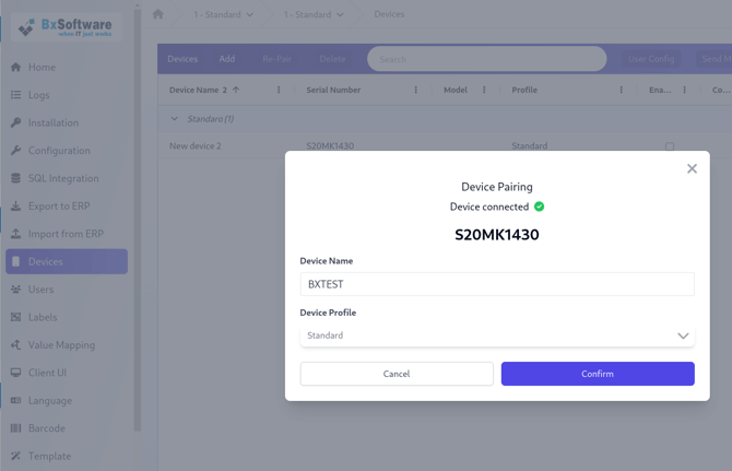 - I BxAdmin vil du få en Device connected dialog som indikerer at vi oppnådde kontakt mellom enhet og BxEngine/BxAdmin. Trykk Confirm på denne dialogen.