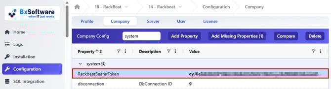 Eller hvis du har tilgang til BxAdmin (kun partnere) legges token inn under Configuration -> Company -> RackbeatBearerToken
