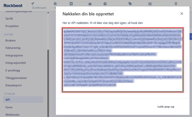 Merk at API-nøkkelen vil knyttes til brukeren den opprettes av. Ønsker du en egen bruker må det opprettes spesielt for integrasjonen. Dette vil trigge en ekstra brukerlisens i Rackbeat.