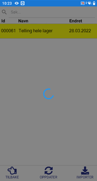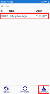 Dersom Referansenr/ID og dato ikke stemmer overens med Visma Net, må du trykke "Importer" nede i høyre hjørne. Du må ikke starte tellingen før du har fått valgt rett liste på samtlige håndterminaler.