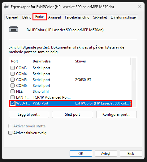 Vi har sett flere tilfeller hvor bruk av WSD-port på skriver fører til at utskrift via BxSmartPrintPro stopper opp. Det går å skrive ut testside fra Windows, men likevel fungerer ikke utskrift fra Bx.